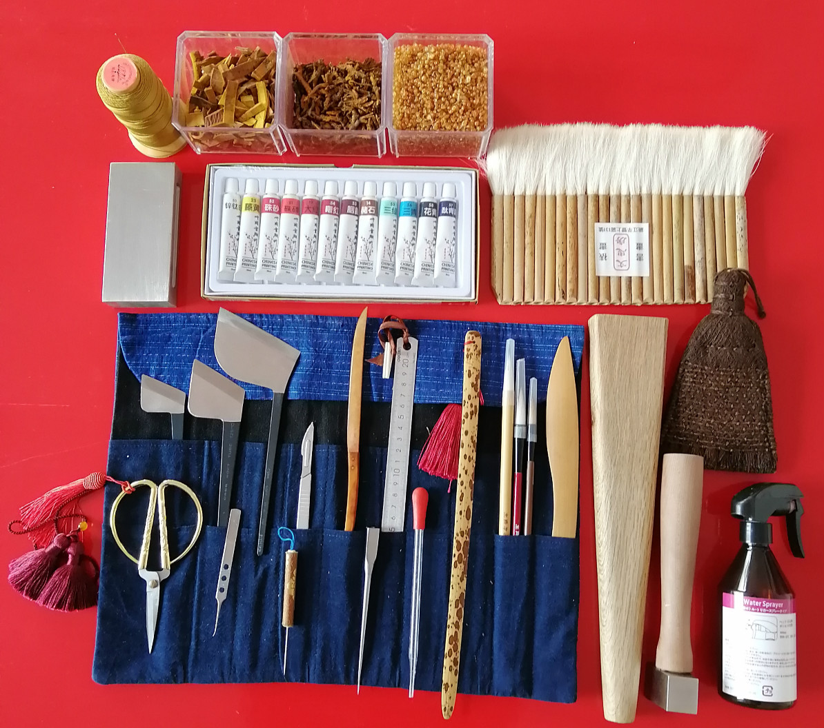 小剪刀,镊子,马蹄刀大中小号,细针锥,手术刀,竹刀,吸管,启画竹,修补毛笔,木槌,铁锤,喷壶,棕刷大中小号,排笔大中小号,不锈钢镇尺大中小号,染料若干。各种用途不尽表述。