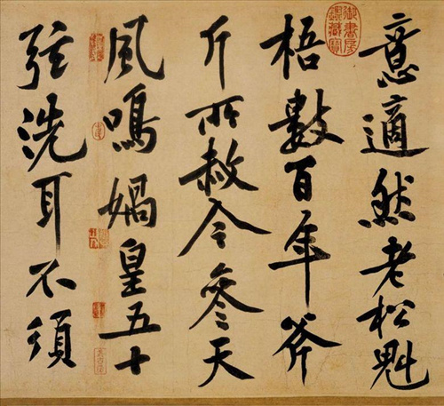 《松风阁诗卷》最能体现其书法形式特征,在这里要强调的是其人文价值与诗性表达。松风阁,即在苏东坡谪贬黄州的长江对岸山坡上,身为“蜀党”成员的黄庭坚于崇宁元年由蜀戎州移鄂州,在松风阁触景生情感慨丛生所书写的诗文。诗曰:“晓见寒溪有炊烟,东坡道人已沉泉。……怡亭看篆蛟龙缠,安得此身脱拘挛?舟载诸友长周旋!”在黑暗政治长年迫害下的诗人,鬓发崔嵬的暮年末路,看到人去楼空,故友物化,连与昔日师友们载舟悠游的自由也只是一个梦想,作品用长枪大战充满力量的点画,如铿锵的音符演奏着一首震天动地的悲怆交响乐。在宋代诗史上有“苏黄”之称,在宋代书法史上,《松风阁诗卷》足称《黄州寒食诗帖》的姊妹篇,同样璀璨夺目彪柄百代。其风神洒荡,号为黄书第一.其用笔方折,纵横挥洒之意跃然纸上,而点画热遒劲,结构紧凑,开张之势最为明显。