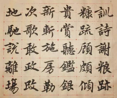 我们写楷书时最忌写一个字去蘸一次墨,这样永远不会有枯笔飞白,最理想的楷书用笔是画之当中浓,两边枯,不光而毛,涩中自有无穷之韵味;最理想的用墨是枯中见润,即在笔酣墨饱的情况下依靠速度和中锋、笔力和笔势拉出来的枯笔,有'干裂秋风,润含春雨'之状。一旦楷书墨色有变化,就会大大增强它的灵动性,更易表现出耐人寻味之神采。